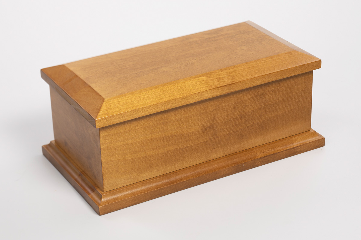 Handmade a high-quality pet ashes casket made from solid wood and has oak natural paint finishing. Bottom opening secures with a felted base.